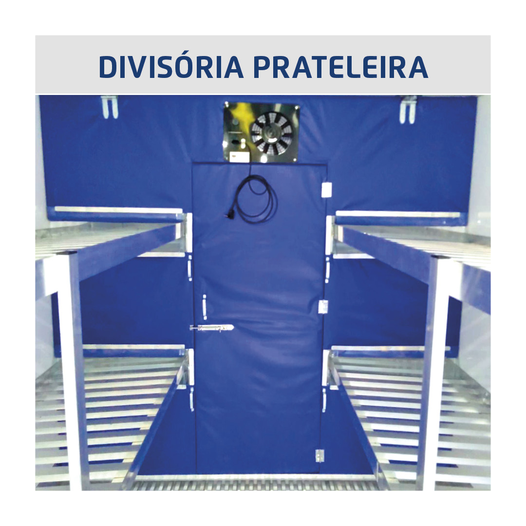 Utilizada principalmente por distribuidoras de alimentos refrigerados, com muitas paradas para diversas entregas durante a viagem. São fabricadas em detalhe para o encaixe perfeito nas prateleiras do baú. Geralmente esta divisória sai junto com o baú, na fábrica. Porém, com nossa equipe de engenharia, podemos fabricar a divisória prateleira para qualquer cliente do Brasil inteiro. Para este modelo, no entanto, as medidas corretas são essenciais.